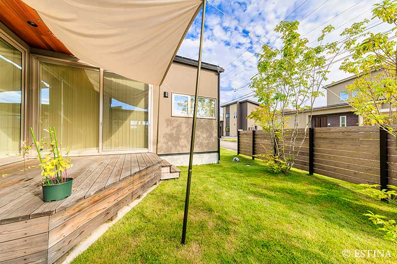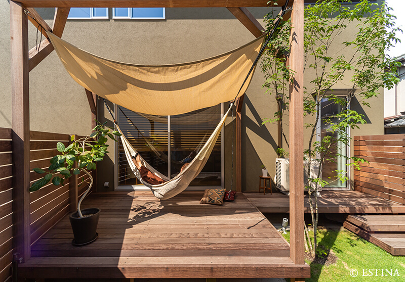 ウッドデッキにシェードをつけて日陰を作ると快適に過ごせます。