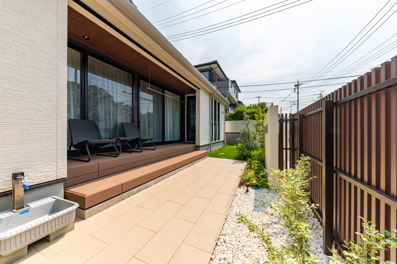 タイルテラスとウッドデッキを組み合わせたセカンドリビング。