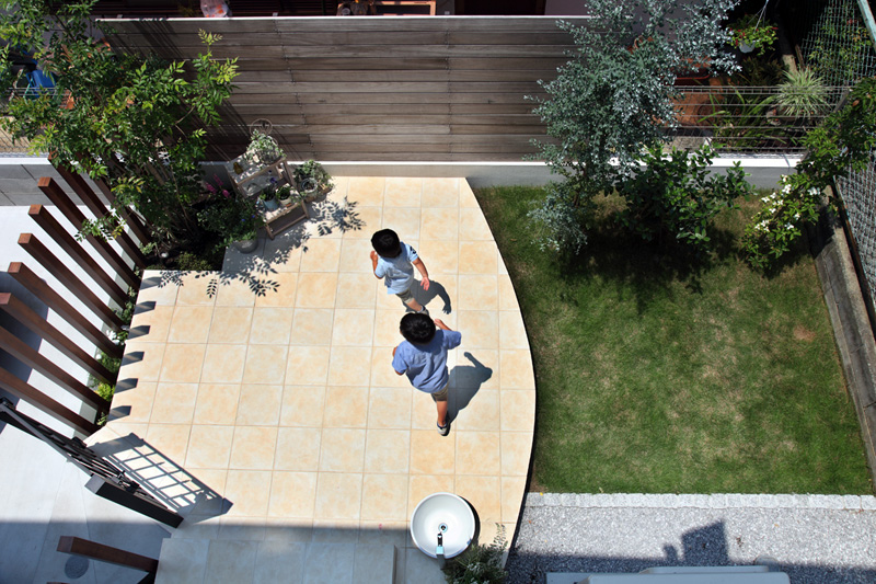 タイルテラスと洗い出し、レンガを組み合わせ単調にならない空間に。